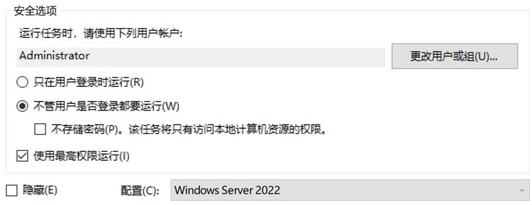 2,在安全选项当中,选择“不管用户是否登录都要运行”,勾选“使用最高权限运行”,配置选择“Windows Server 2022”。